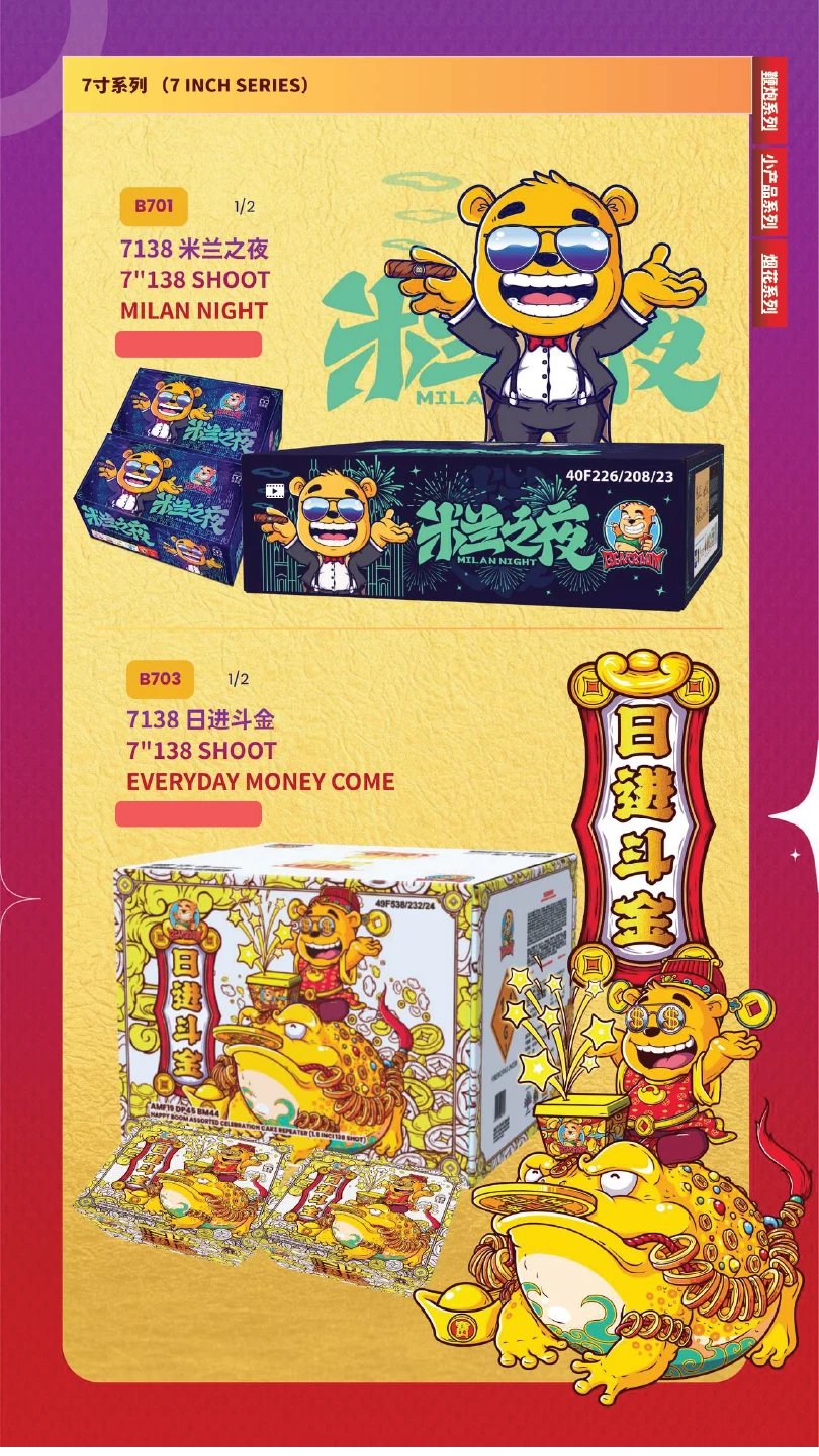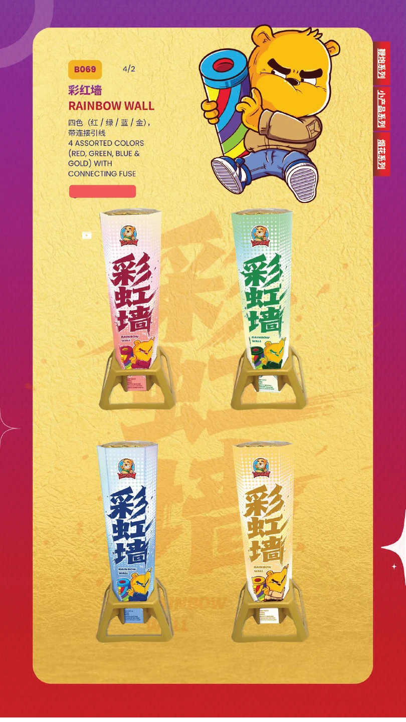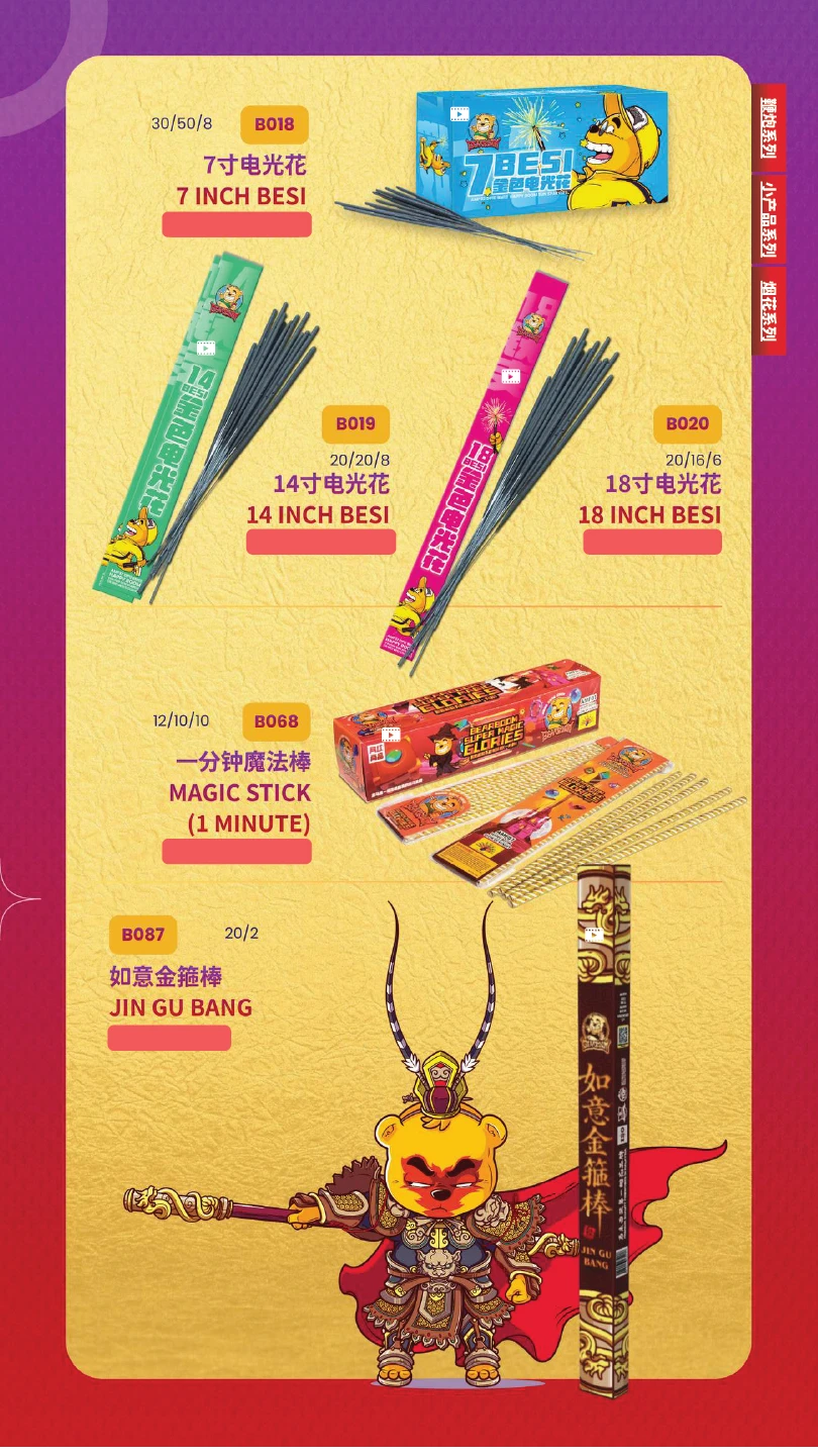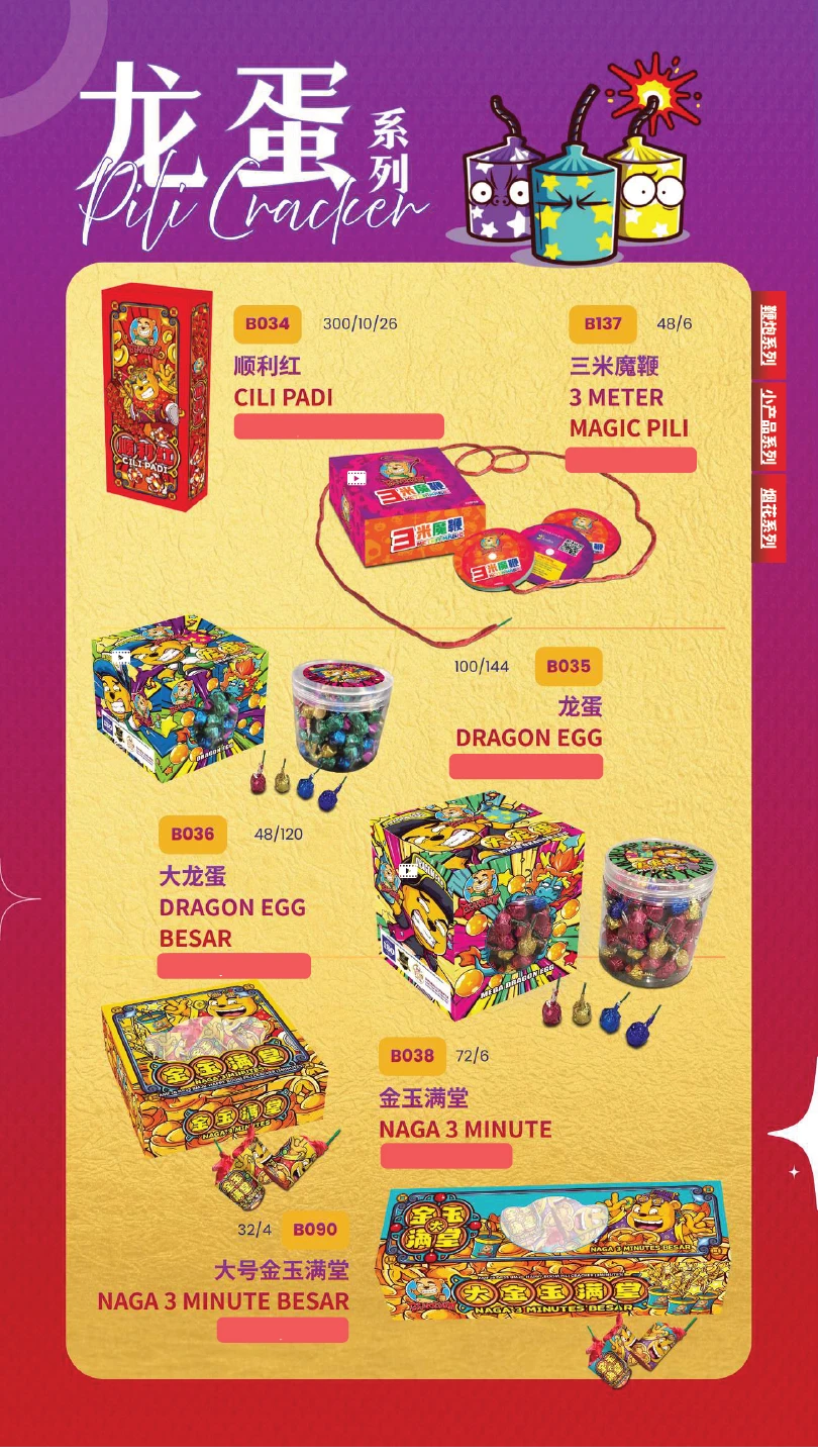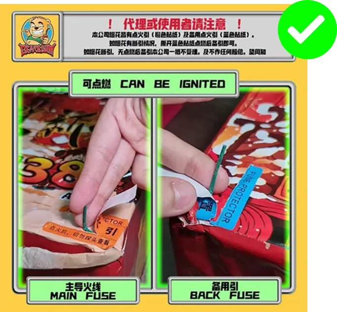 1) 本公司烟花皆有主点火引(橙色贴纸)及备用点火引(蓝色贴纸)。如烟花有断引情况,请静候一会,撕开蓝色贴纸并点燃后备引即可。如烟花断引无点燃后备引本公司一概不受理 及不作任何赔偿。望周知。 All of our fireworks come with a main fuse (marked with an orange sticker) and abackup fuse (marked with a blue sticker). In case of a fuse failure, please peel backthe blue sticker and ignite the backup fuse. If a fuse fails and the backup fuse is notignited, our company will not be responsible for any claims or compensation. Thankyou for your understanding.