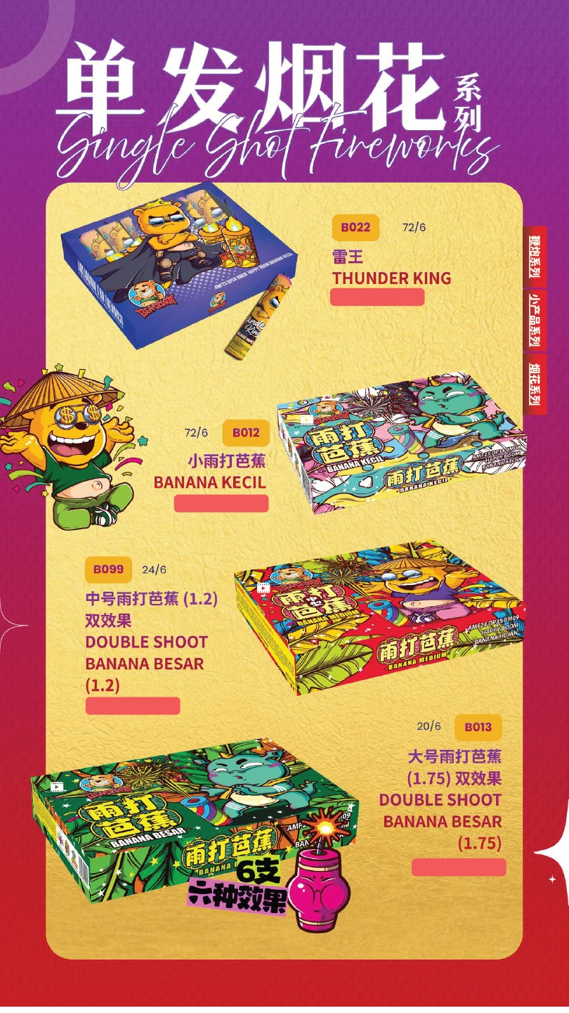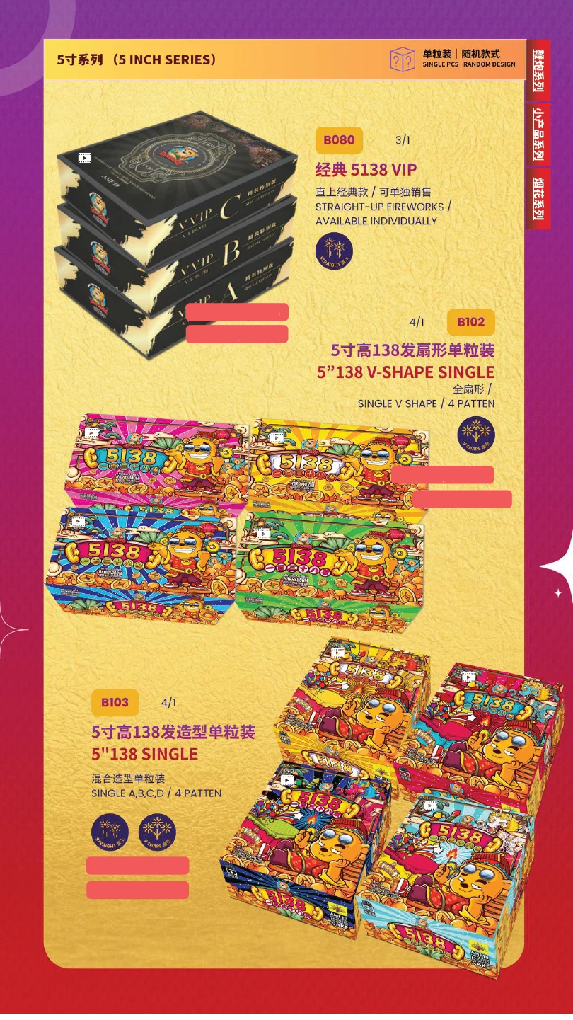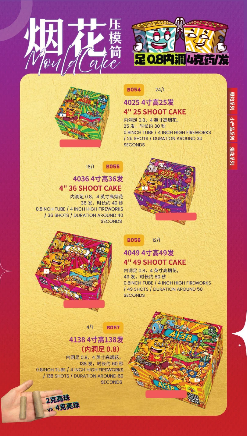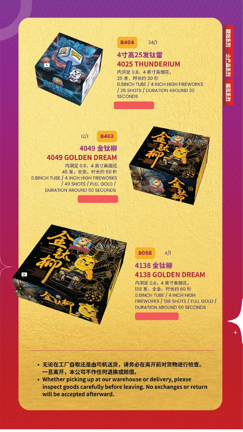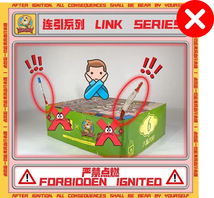 4) 如不幸发生炸筒事故,本公司将不会负责除烟花以外的任何赔偿。(包括受伤) In the event of an unfortunate explosion incident, our company will not be responsible for any compensation other than for fireworks.