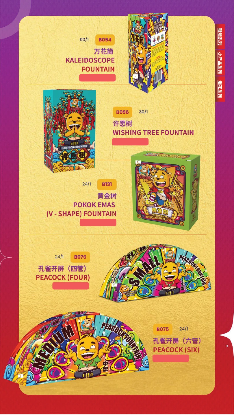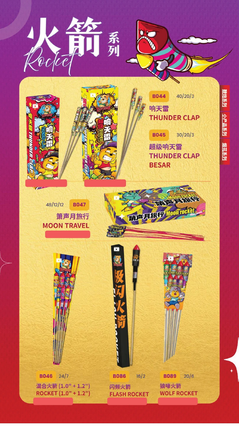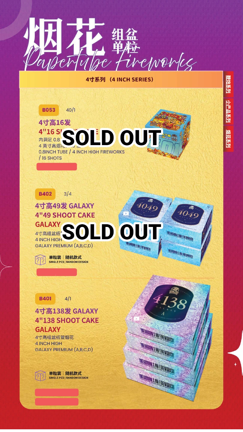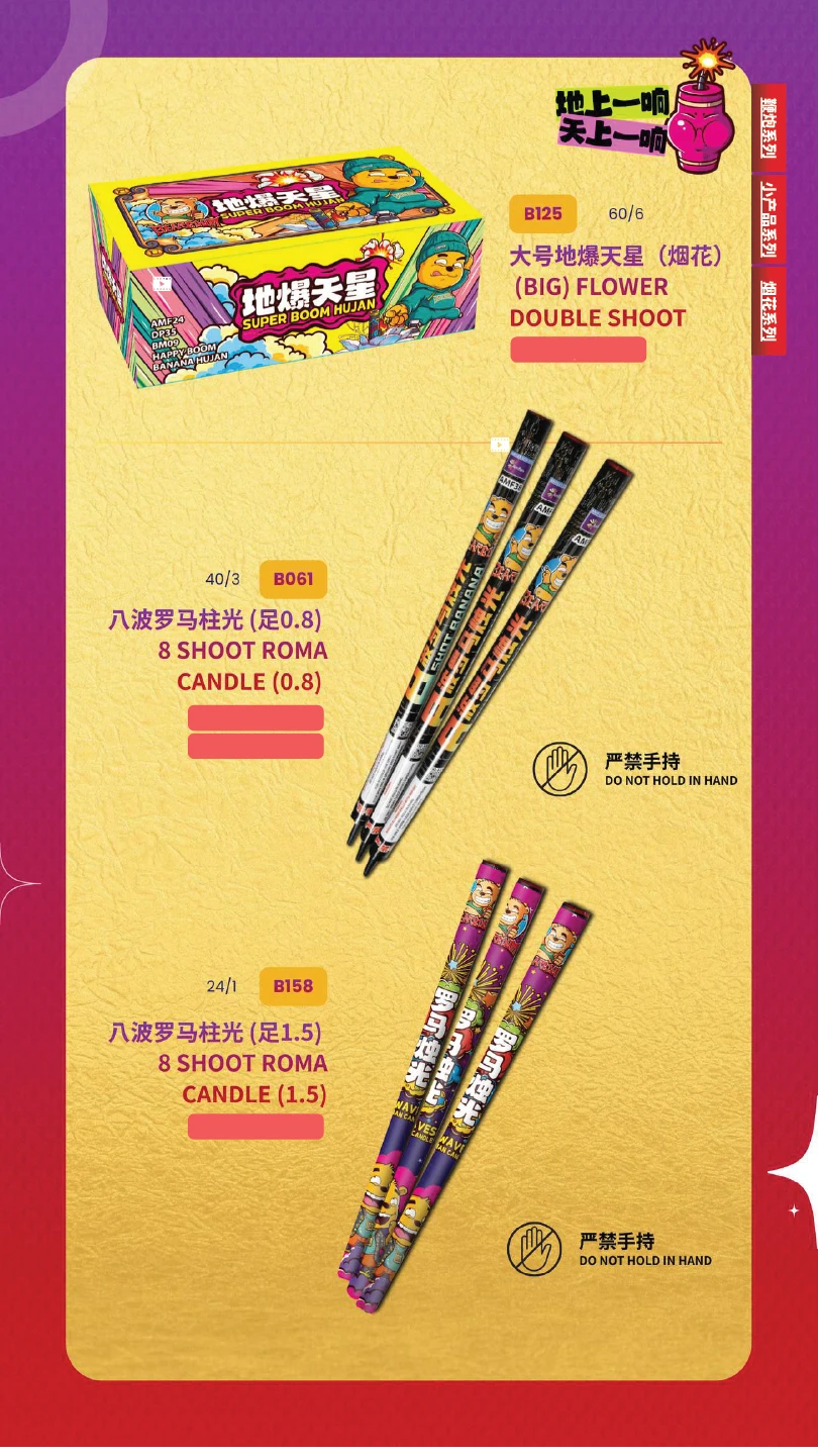 4) 如不幸发生炸筒事故,本公司将不会负责除烟花以外的任何赔偿。(包括受伤) In the event of an unfortunate explosion incident, our company will not be responsible for any compensation other than for fireworks.